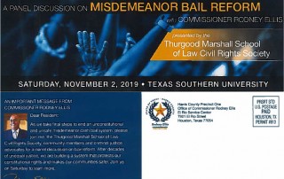 Commissioner Rodney Ellis would like to invite you and community members to a Misdemeanor Bail Reform Panel Discussion at the Thurgood Marshall School of Law, this Saturday, November 2, 2019, from 10 am to 12 pm. Email Terrance.Koontz@cp1.hctx.net or call 346.286.1950 to RSVP.