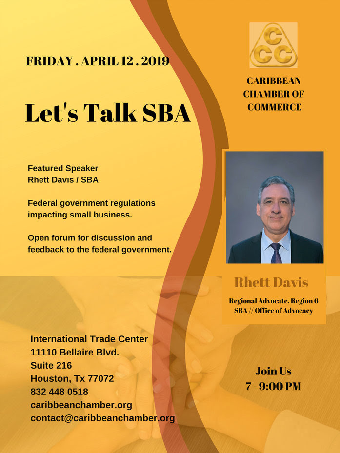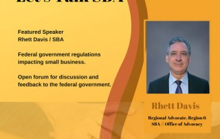 Rhett Davis from the SBA Office of Advocacy will be joining us for our April 12th meeting. Rhett will be listening to our concerns about any federal government regulations that are burdening our small business. This is a unique opportunity to offer feedback to the federal government from the business community.