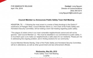 Following the most recent in a series of fatal shootings in the District F subdivision of Parkglen West, Council Member Steve Le, Vice Chair of the Public Safety and Homeland Security Committee, will be holding a town hall meeting regarding public safety. “This plague of violent crime in our most vulnerable neighborhoods cannot and will [...]