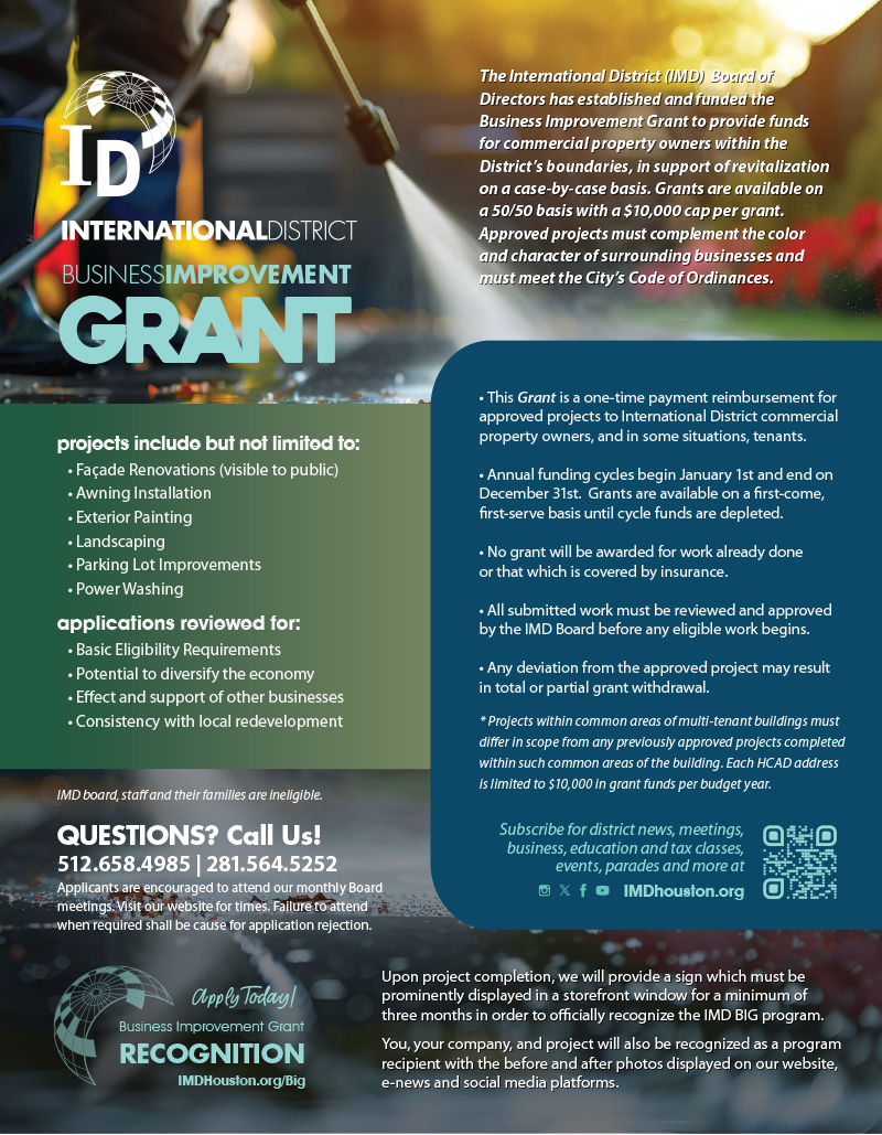 The Board of Directors for the International District (IMD) has established and funded the Business Improvement Grant to provide funds for commercial property owners within the District’s boundaries, in support of revitalization on a case-by-case basis. Grants are available on a 50/50 basis with a $10,000 cap per grant. Approved projects must complement the color and character of surrounding businesses and must meet the City’s Code of Ordinances.