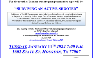 Due to the rising Covid positive cases in our communities, the HPD Citywide PIP meeting scheduled for Tuesday, January 11, 2022 at 7 PM will be canceled. The next Citywide PIP meeting will take place on Tuesday, March 8, 2022. The Citywide and Divisional PIP Officers are still providing the same level of services in [...]