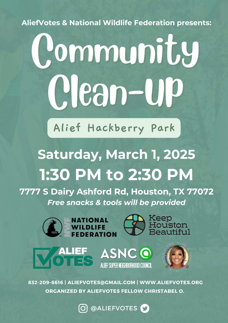 Join us on Saturday, March 1, 2025, from 1:30 PM to 2:30 PM at Hackberry Park in Alief for a community clean-up hosted by AliefVotes and the National Wildlife Federation. Free tools and snacks will be provided! Open to all ages. Everyone in- and out- of Alief is invited. No RSVP Required. Address: 7777 S [...]