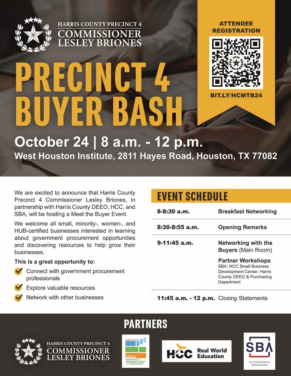 We are excited to announce that Harris County Precinct 4 Commissioner Lesley Briones, in partnership with Harris County DEEO, HCC, and SBA, will be hosting a Meet the Buyer Event. We welcome all small, minority-, women-, and HUB-certified businesses interested in learning about government procurement opportunities and discovering resources to help grow their businesses. Register [...]