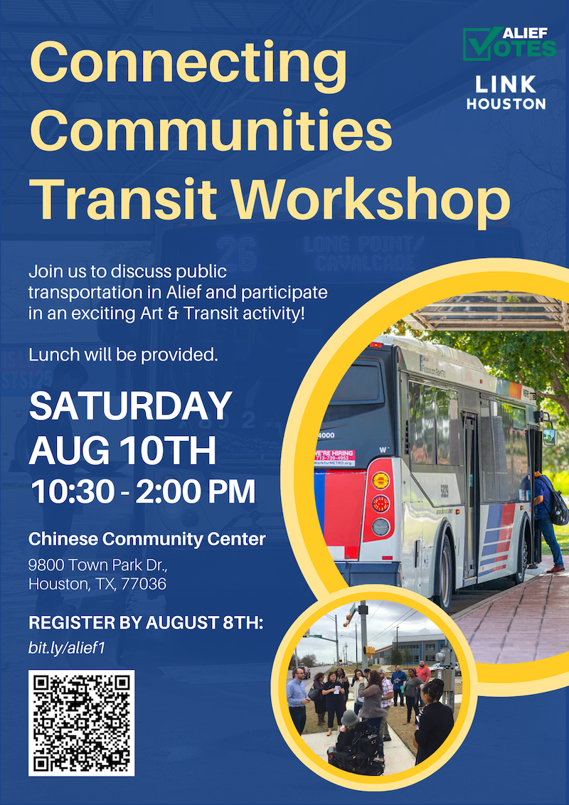Join LINK Houston and AliefVotes this Saturday, August 10th from 10:30 AM to 2 PM for a transportation community listening session. Alief: Have transportation needs? Want more bus service or a circulator? Make your voice heard! Open to all. Meet at the Chinese Community Center, Room #122 (9800 Town Park.) Register at bit.ly/alief1 Additional Languages: [...]