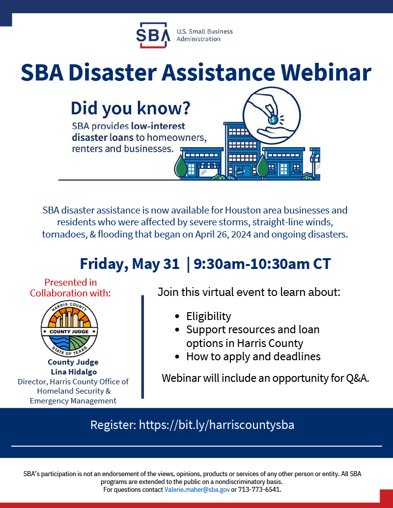SBA disaster assistance is now available for Houston area businesses and residents who were affected by severe storms, straight-line winds, tornadoes, & flooding that began on April 26, 2024 and ongoing disasters. Register Now
