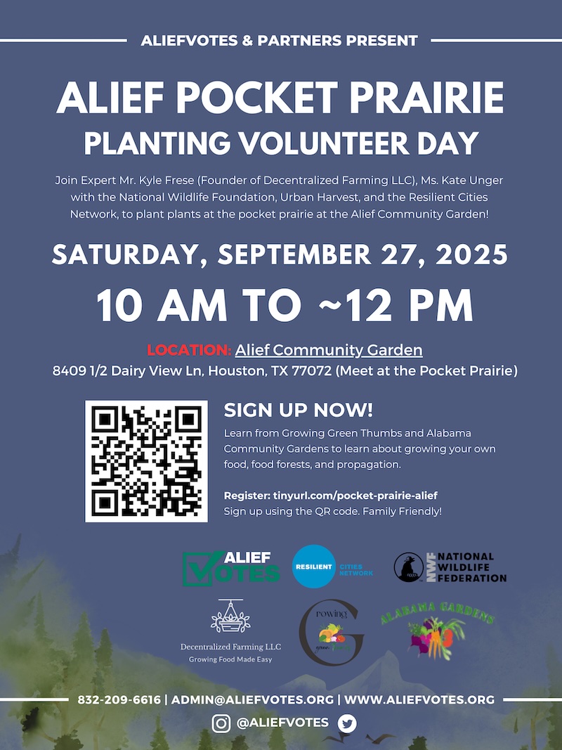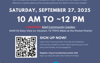Join Expert Mr. Kyle Frese (Founder of Decentralized Farming LLC), Ms. Kate Unger with the National Wildlife Foundation, Urban Harvest, and the Resilient Cities Network, to plant plants at the pocket prairie at the Alief Community Garden! Sign up now!