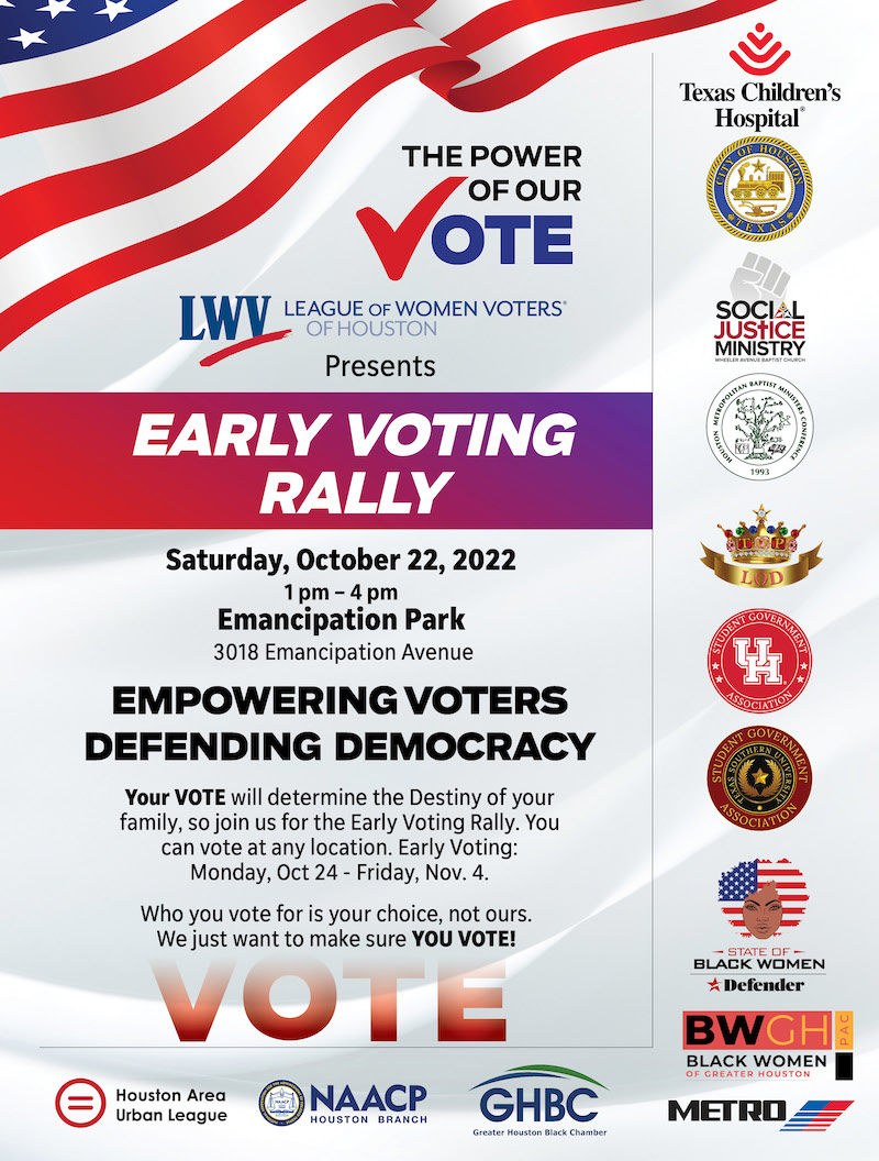 Your VOTE will determine the Destiny of your family, so join us for the Early Voting Rally. You can vote at any location. Early Voting: Monday, Oct 24 - Friday, Nov. 4.