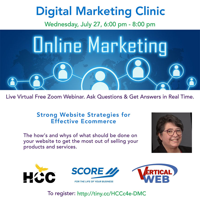 Digital Marketing Clinic by HCC Featuring Beth Guide–Wed-07/27/22-6p-8p-CST-Strong Website Strategies for Effective Ecommerce–Learn from Beth’s 30+ years of experience, Live Web Illustrations & Lots of Group Chat Q&A-Cost Free: http://tiny.cc/HCCc4e-DMC