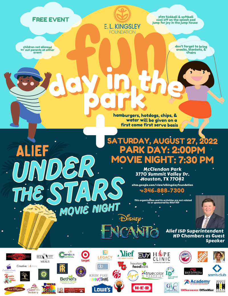 On August 27th, 2022, the E.L Kingsley Foundation is hosting a MOVIE NIGHT at MCLENDON PARK. It is going to be a FREE EVENT with food and drinks provided. Additionally, our guest speaker is going to be the Alief ISD Superintendent HD Chambers.