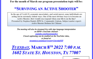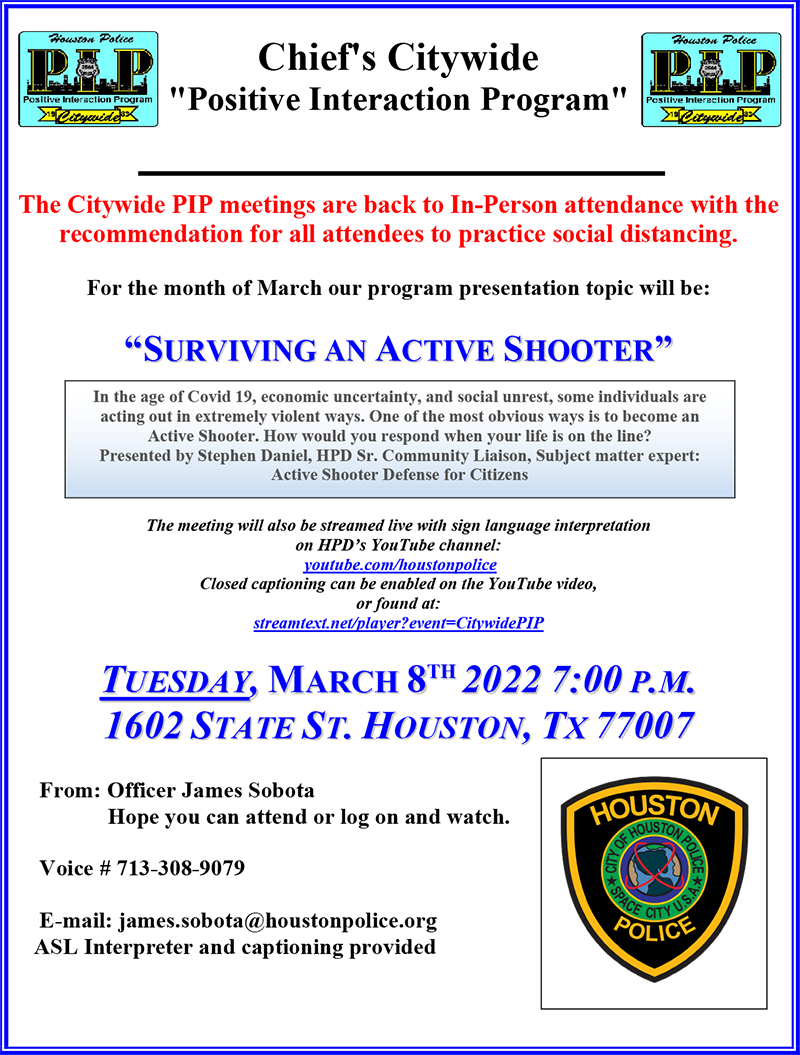 The meeting will be also be streamed live with sign language interpretation on HPD’s YouTube channel: youtube.com/houstonpolice Closed captioning can be enabled on the YouTube video, or found at: streamtext.net/player?event=CitywidePIP