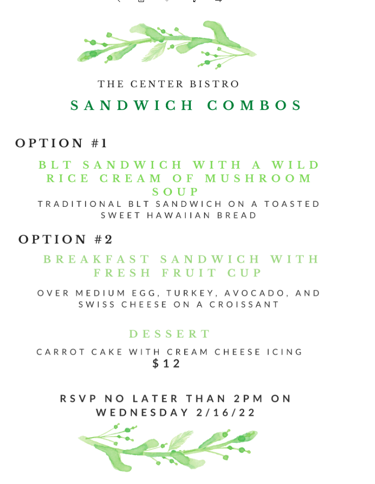Come enjoy lunch at The Center Bistro, 12160 Richmond Avenue, on Thursday February 17 from 11:00 a.m. until Noon. RSVP no later than Noon on Wednesday, February 16. Click picture below to RSVP.