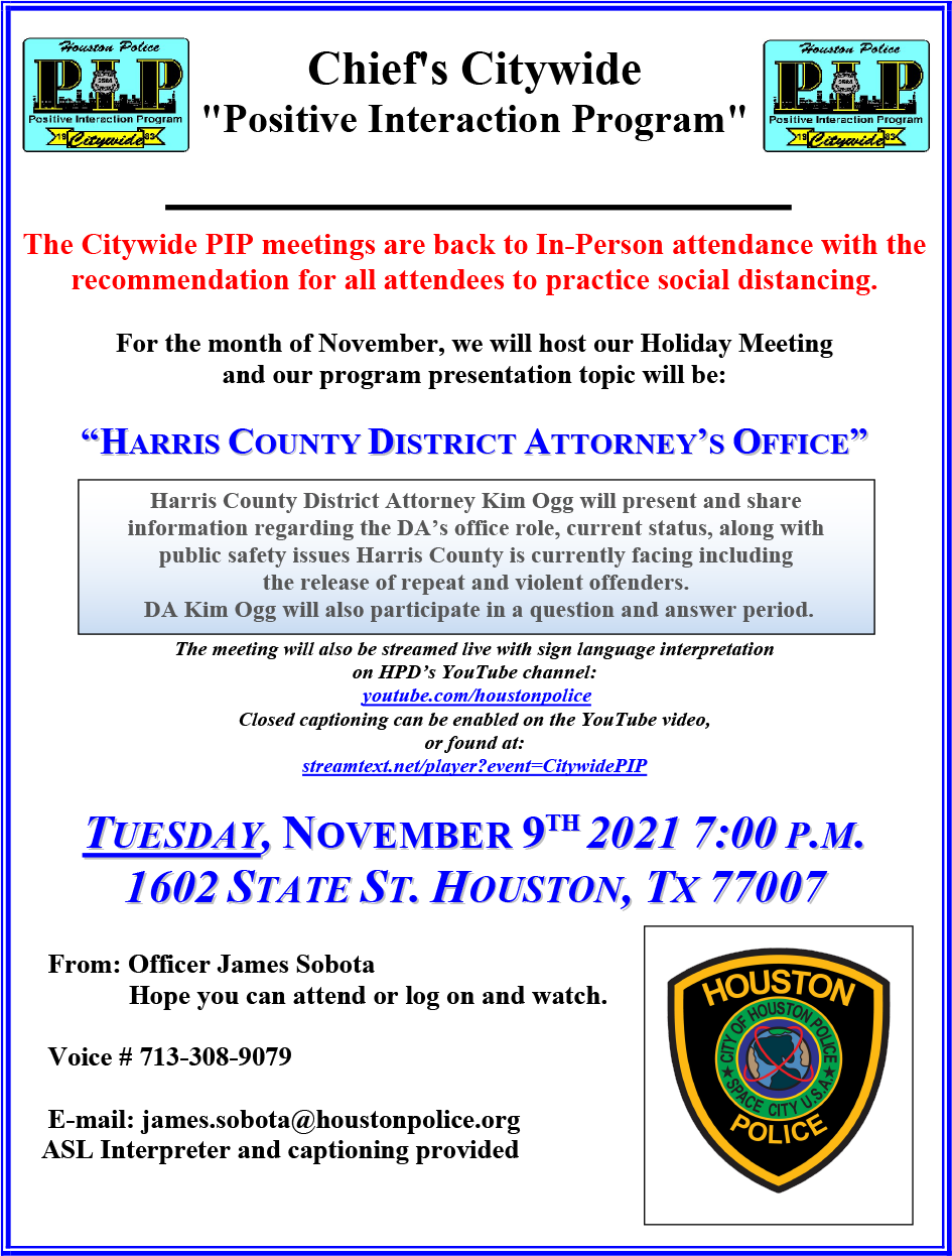 The Citywide PIP meetings are back to In-Person attendance with the recommendation for all attendees to practice social distancing.