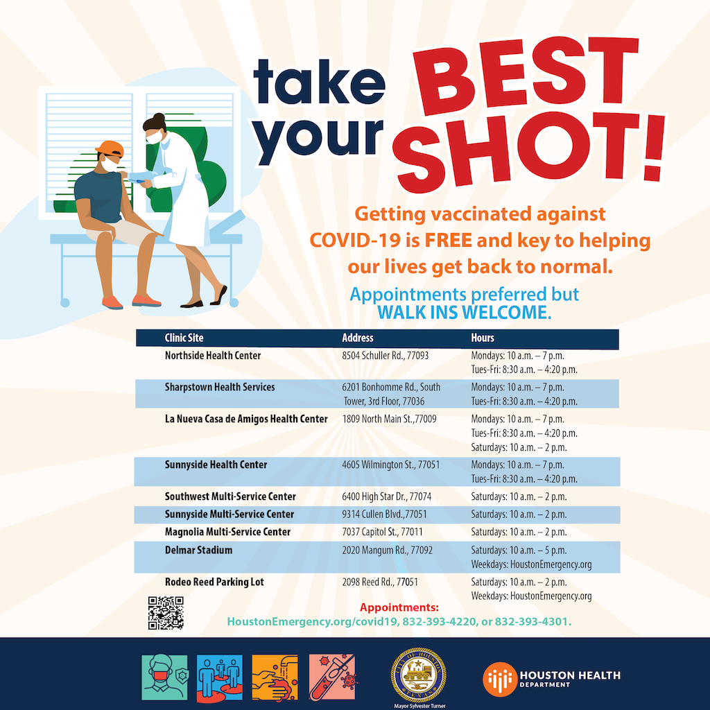 With sites across #Houston accepting walk-ins (or appts), getting vaccinated against #COVID19 has never been easier! Visit HoustonEmergency.org or call 832-393-4301 or 832-393-4220 to find a nearby site. #TakeYourBestShot at returning to normal by getting vaccinated. #HouNews 免费接种#COVID19疫苗是我们恢复正常生活的关键。我们的服务点既可以接受预约,也可以无预约提供接种。访问HoustonEmergency.org或致电832-393-4301或832-393-4220查找附近的站点或进行预约。 #TakeYourBestShot就在今天! Vacunarse contra el #COVID19 es GRATIS y clave para volver a la normalidad. Nuestros sitios están abiertos a visitantes sin cita. Visita HoustonEmergency.org o llama al [...]