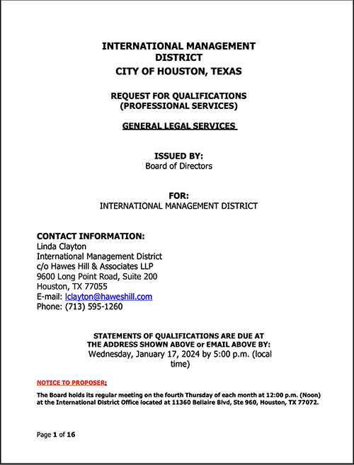 International Management District (“District”) is seeking a Statement of Qualifications (SOQ) from interested attorneys and law firms to provide Legal Services on an as needed or case-by-case basis in accordance with the terms, conditions and requirements set forth in the Request for Qualifications (RFQ). District will be selecting an experienced attorney and/or law firm [...]