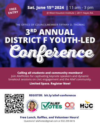 Houston City Councilmember Tiffany D. Thomas of District F is hosting her third annual District F Youth-Led conference this Saturday, June 15, 2024, from 11 AM to 3 PM. Please join us! Everyone is invited. Youth engagement is part of public safety. We invite all Houstonians to attend to learn about community issues, public safety, volunteerism, policy, [...]