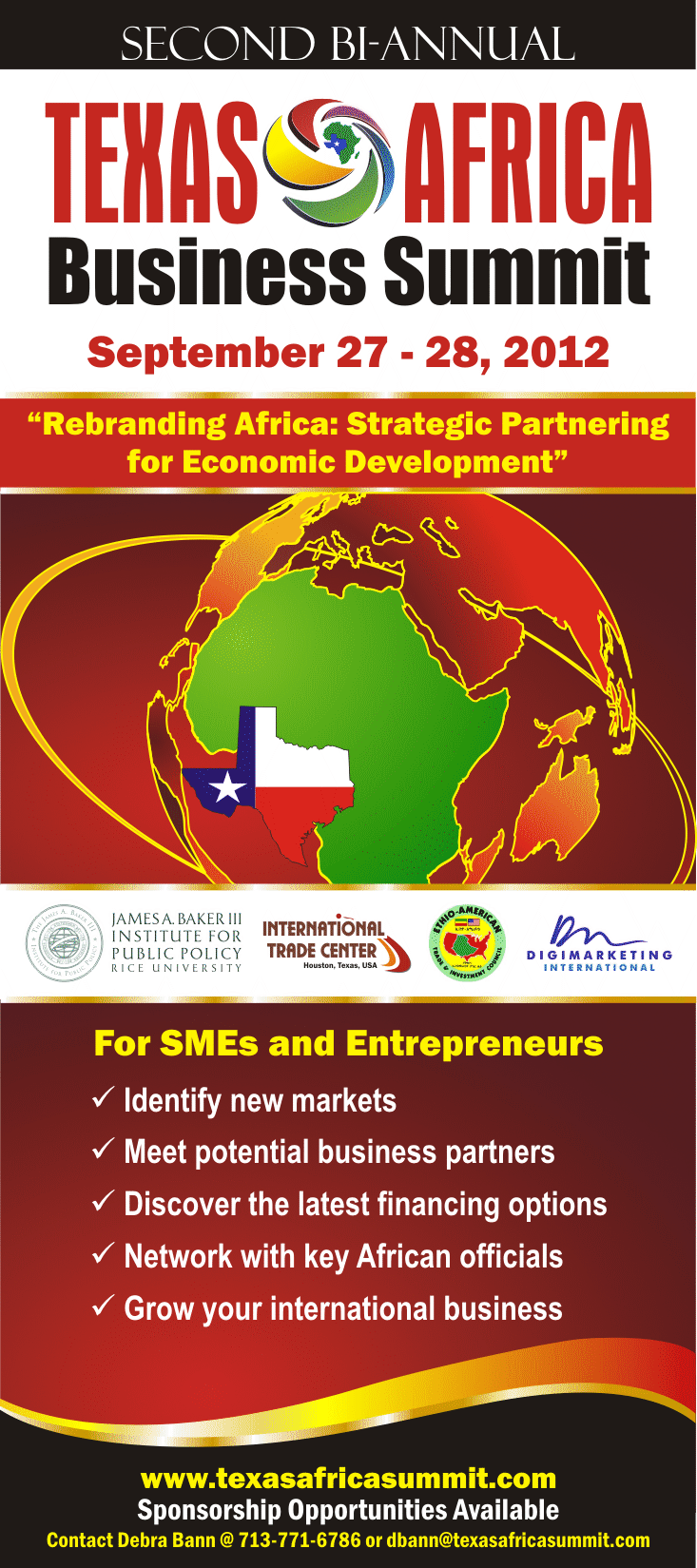 September 27-28, 2012 Rebranding Africa: Strategic Partnering for Economic Development For SMEs and Entrepreneurs Identify New Markets Meet Potential Business Partners Discover the Latest Financing Options Network with Key African Officials Grow your International Buisness Click Here to visit the offical TABS website or contact Debra Bann at 713-771-6786.