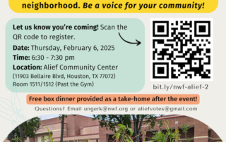 Join us on Thursday, February 6, 2025, from 6:30 PM to 7:30 PM at the Alief Neighborhood Center (Room 1511) for a community meeting hosted by AliefVotes and the National Wildlife Federation! Free dinner will be provided! Free food and drinks. Open to all ages. Everyone in and out of Alief are invited. RSVP: bit.ly/nwf-alief-2